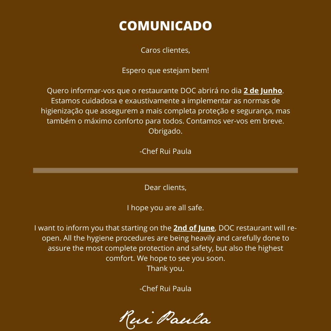 O DOC é um espaço para “Degustar Ousar Comunicar” onde Rui Paula, com um olhar moderno e inventivo, faz da cozinha um laboratório histórico baseado em várias gerações de receitas culinárias.